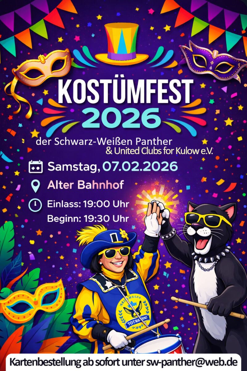 Zu einem Kostümfest mit Live-Musik und Live-Beiträgen laden traditionell die „Schwarz-weißen Panther“ ein. Selbstverständlich besucht auch Prinz Peter mit seinem Hofstaat das Kostümfest.